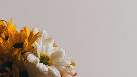A close-up captures bright yellow and white flowers. The composition features the blooms on a soft, neutral background, bathed in natural light. This visual arrangement highlights the detailed textures and colors of the floral arrangement. Potential applications could include promotional material, or decorative design elements.