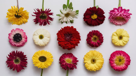 different colored gerbera flowers on a white background, top view