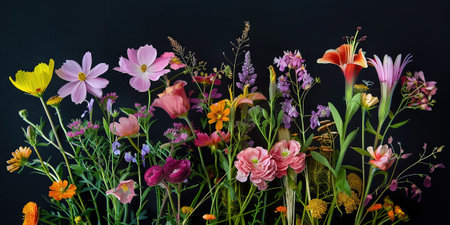 Brightly colored flowers in various shapes and sizes create a stunning display, set against a contrasting black backdrop.