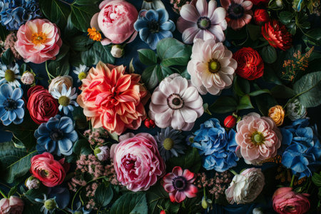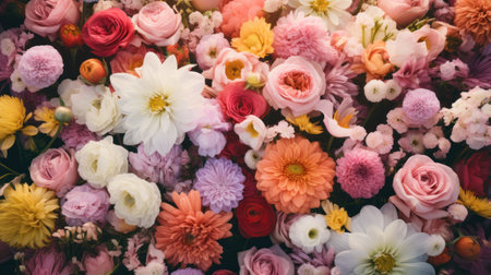 A vibrant and colorful collection of various flowers, including daisies, peonies, and others.