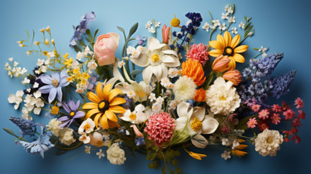 Colorful Spring Flowers on Blue Background. Greeting card with space for text, top view. Mother's Day, Woman's Day, Easter, Valentine's Day, Wedding, and Birthday celebration concept.