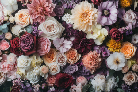 An overhead shot presents a diverse floral arrangement featuring various flower types and petals in vibrant colors. The composition includes multiple blooms with varying textures and shades, with a bright background. This image could be suitable for decorative designs or editorial purposes.