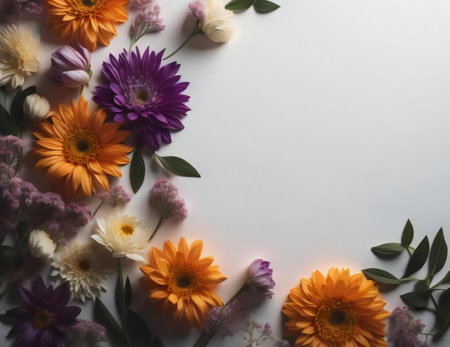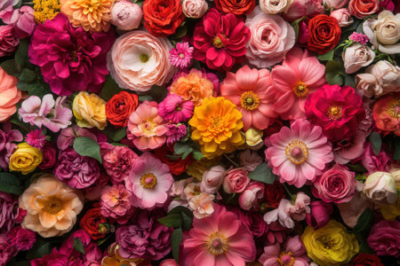 Colorful flowers background. Top view. Flat lay. Copy space. generative ai