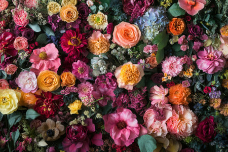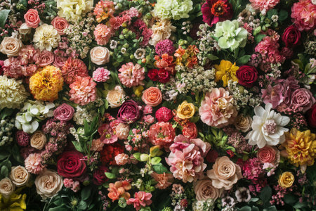 A vibrant, colorful floral wall of various blooms, close-up.