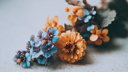 , slightly high-angle view captures a small grouping of contrasting flowers, featuring one prominent warm orange bloom with a dark center beside several clusters of small, intensely blue florets, all resting on a muted, light-colored, subtly textured background.