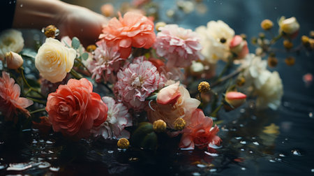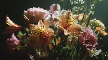 This stunning image features a bouquet of flowers adorned with sparkling water droplets, capturing the essence of freshness and beauty in nature. Perfect for nature lovers.