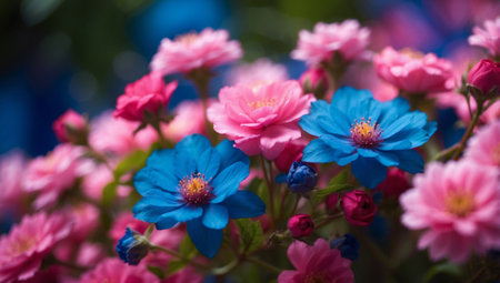 AI Generated. Exquisite close up shot of vibrant blue and pink flowers blooming beautifully in high definition