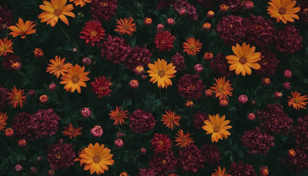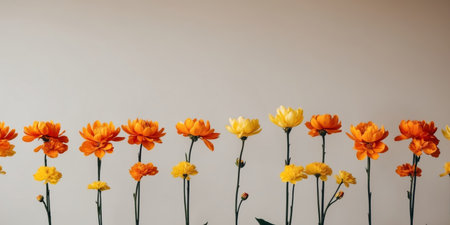 AI Generated. A bunch of orange and yellow flowers are arranged in a row