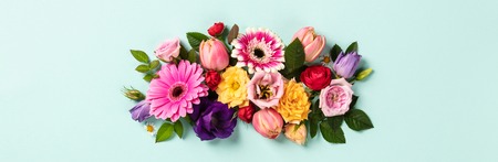 Pastel floral background banner. Top view of pastel colored spring flowers in pink, white yellow, orange on blue background mothers day concept, copy space for text
