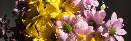 bouquet of yellow and violet daisies with water drops, panoramic shot