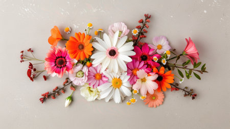 A stunning display of bright and vibrant flowers arranged on a soft beige background, ideal for use in celebrations, invitations, or as decorative art.