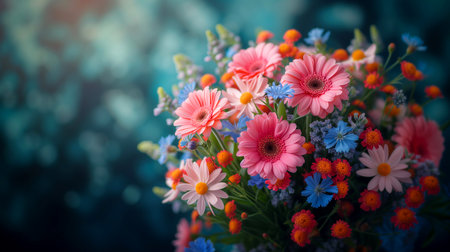 Bouquet of colorful flowers on a blue bokeh background