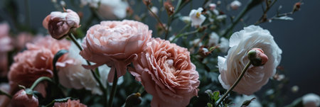 Beautiful bouquet of roses, gypsophila and other different flowers on dark background