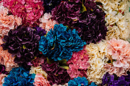 Floral art made of colorful artificial flowers in view