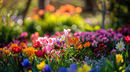 Vibrant flowerbed filled with multicolored flowers in natural light