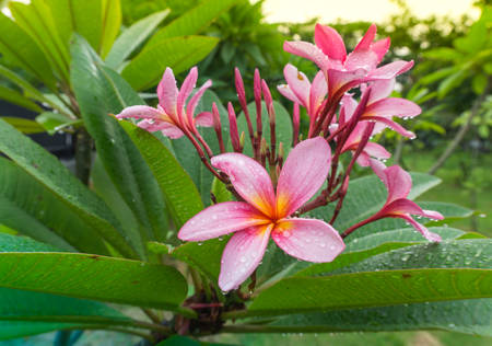Pink frangipani flowers are blooming in the rainy season