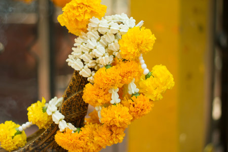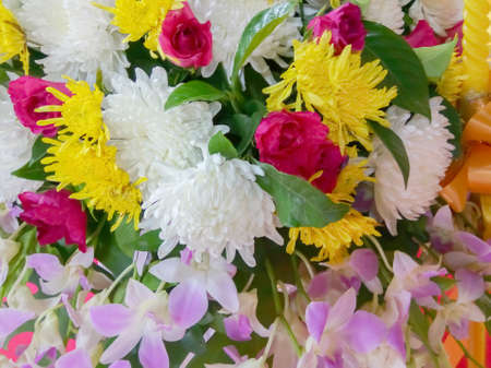Hand made flower necklace using in the temple, colorful flower with ribbon use for praying in Buddhist temple