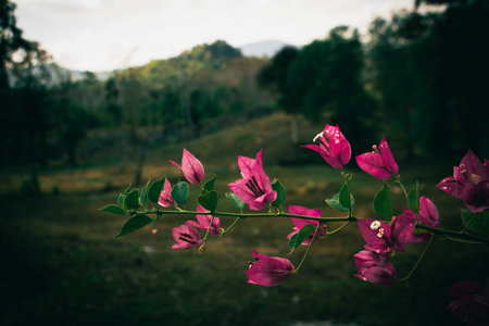Pink bougainvillea branch in focus with blurred mountain countryside background, tropical nature scene, peaceful travel landscape.