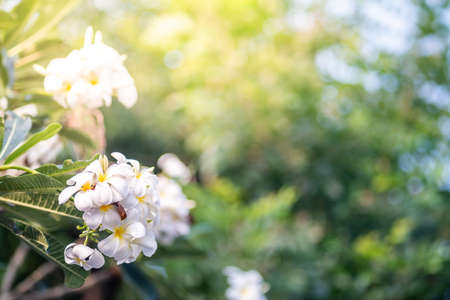 Tropical Frangipani flower (Plumeria alba) and green leaves on blur background in the park with flare light. Spa and wellness concept in resort