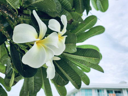 A set of white and yellow plumeria frangipani flowers on the tree in Thailand. Close up with bokeh