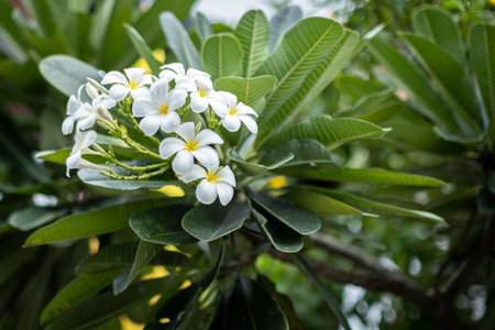 A close-up view of a bouquet of white and yellow plumeria blooming beautifully during the day with blurred green leaves, bokeh light as a backdrop, common in rural Thailand.
