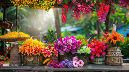 A stunning visualization of a flower market featuring vibrant bouquets in wicker baskets, surrounded by lush greenery, and illuminated by soft natural light.