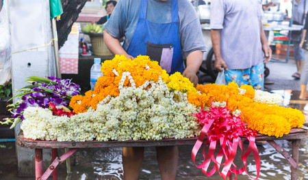 garland flowers selling in table shop in Thai walking market