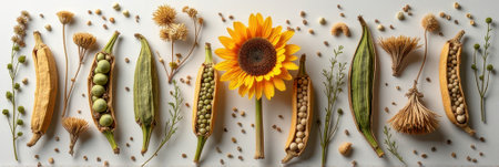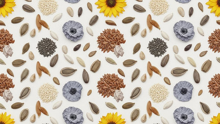 A flat lay of various seeds and small flowers scattered across a white background.
