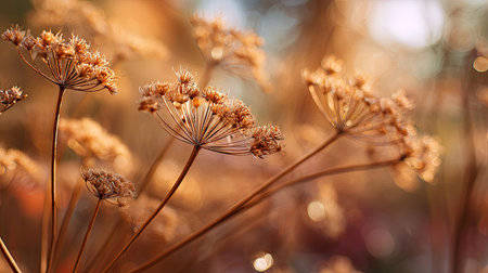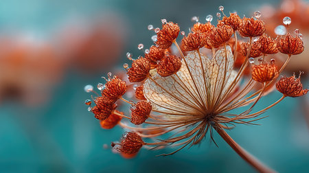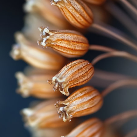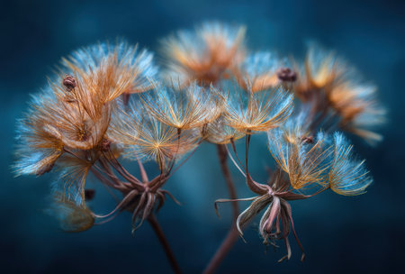 Close-up of delicate seedheads in golden-brown hues against a blurred dark teal background