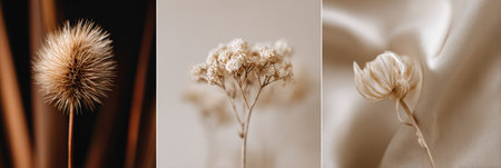 Dry flowers create a delicate arrangement against a smooth fabric, highlighting their subtle beauty in a tranquil afternoon atmosphere.