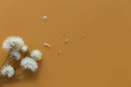 Dried dandelion flowers on colorful background. Nature concept backdrop.Top view. Flat lay. Copy space
