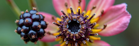 Vibrant pink flower with blackberries in natural close-up. That the image is generated using AI.