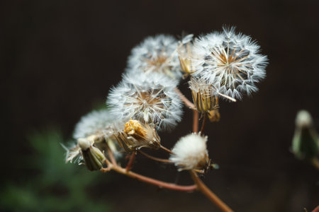 A plant with fluffy light flowers and a broken stem on a dark brown background. Wildlife in autumn. Close-up photo.