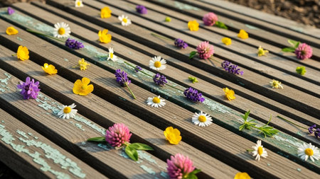 Top view of meadow flowers. Wild flowers grow on the field. AI-Generated images. Top view of a scattering of field and meadow flowers and herbs