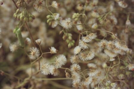 Bell shape brown dry little romantic flowers branch on light background with lovely orange vintage effect macro