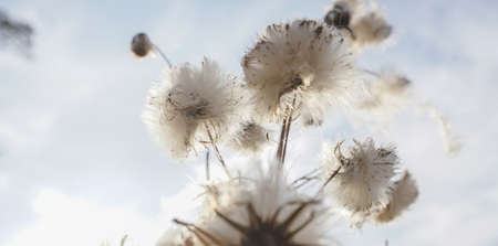 White fluffy flowers of wild thistle closeup