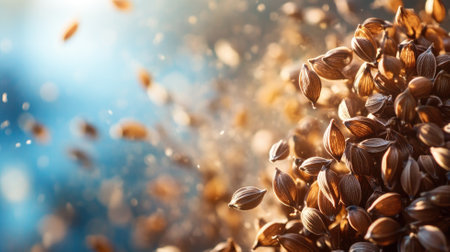 Close-up of brown seeds scattering in wind with blurred blue background