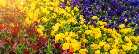 Blooming colorful bright flowers pansies on flowerbed in spring