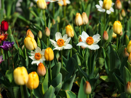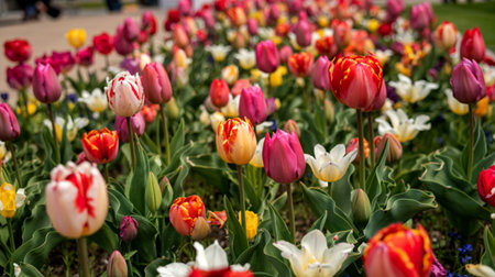 Multicolor flowerbed of tulips spring flowers. Beautiful spring background