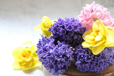 Hyacinth, tulips and peony flowers on light concrete background. Spring Greeting card. Flat lay, top view, copy space.