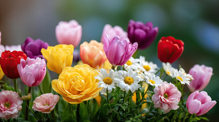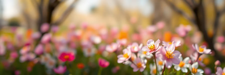 Colorful flower field with vibrant spring blossoms in garden