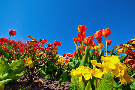 Bright yellow and red tulips on blue sky