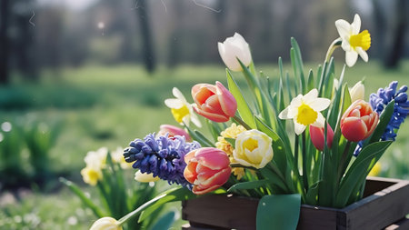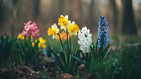 Beautiful spring garden with daffodils and hyacinths