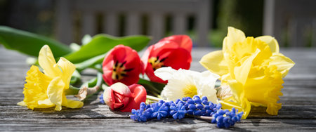 First springs flowers Muscari, Primroses and Tulips background mix.