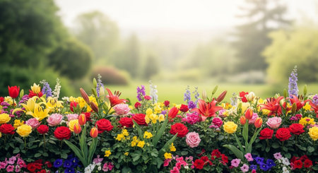 Vibrant flower garden landscape with colorful blossoms in bloom