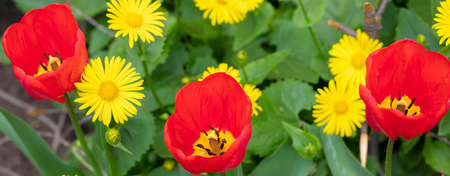 Banner red flowers tulips on a yellow background.