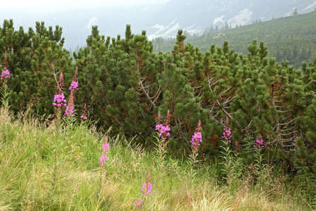 The dwarf mountain pine, forest herbs and flowers under the Kezmarsky peak in the High Tatras.