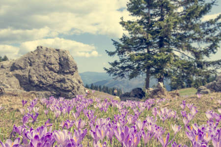 Blooming crocuses on meadow landscape photo. Beautiful nature scenery photography with mountains on background. Idyllic scene. High quality picture for wallpaper, travel blog, magazine, article