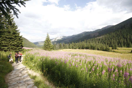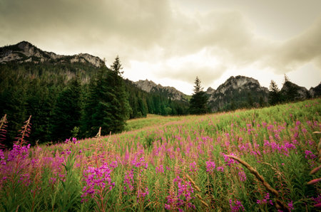 Beautiful summer landscape in the mountains. Meadow with pink flowers. Mountain meadow with flowers in the summer, Tatra Mountains, Poland
