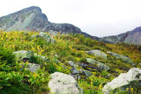 Beautiful mountains landscape in Carpathian. Yellow flowers at rock